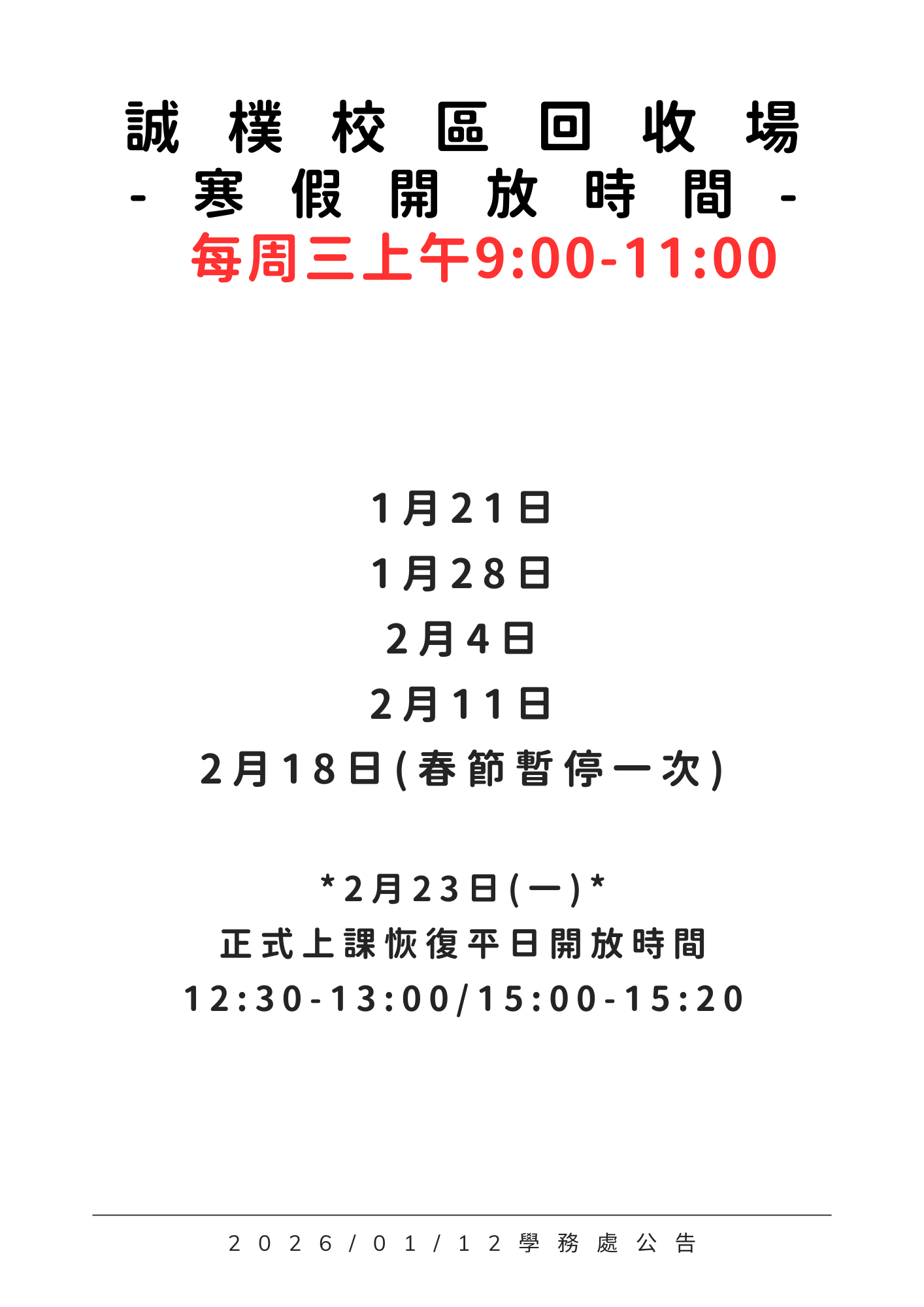 貼心提醒~寒假即將開始,一起落實垃圾分類。回收場開放時間:每周三上午9:00至11:00,詳情請參閱下圖。